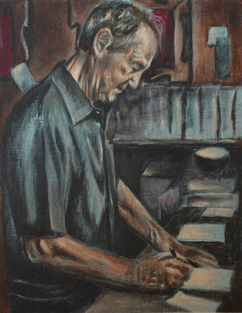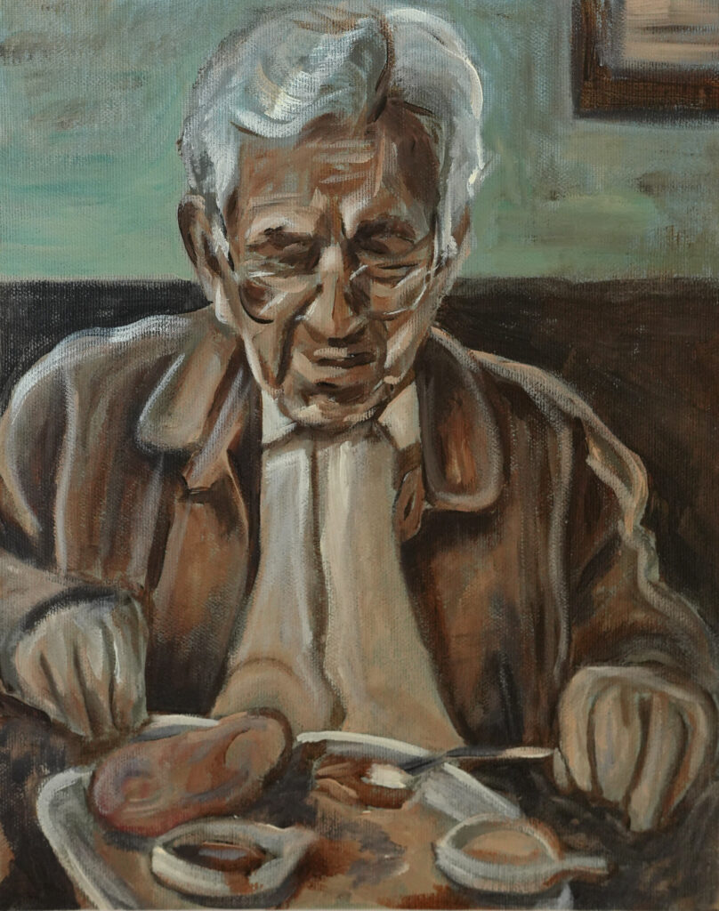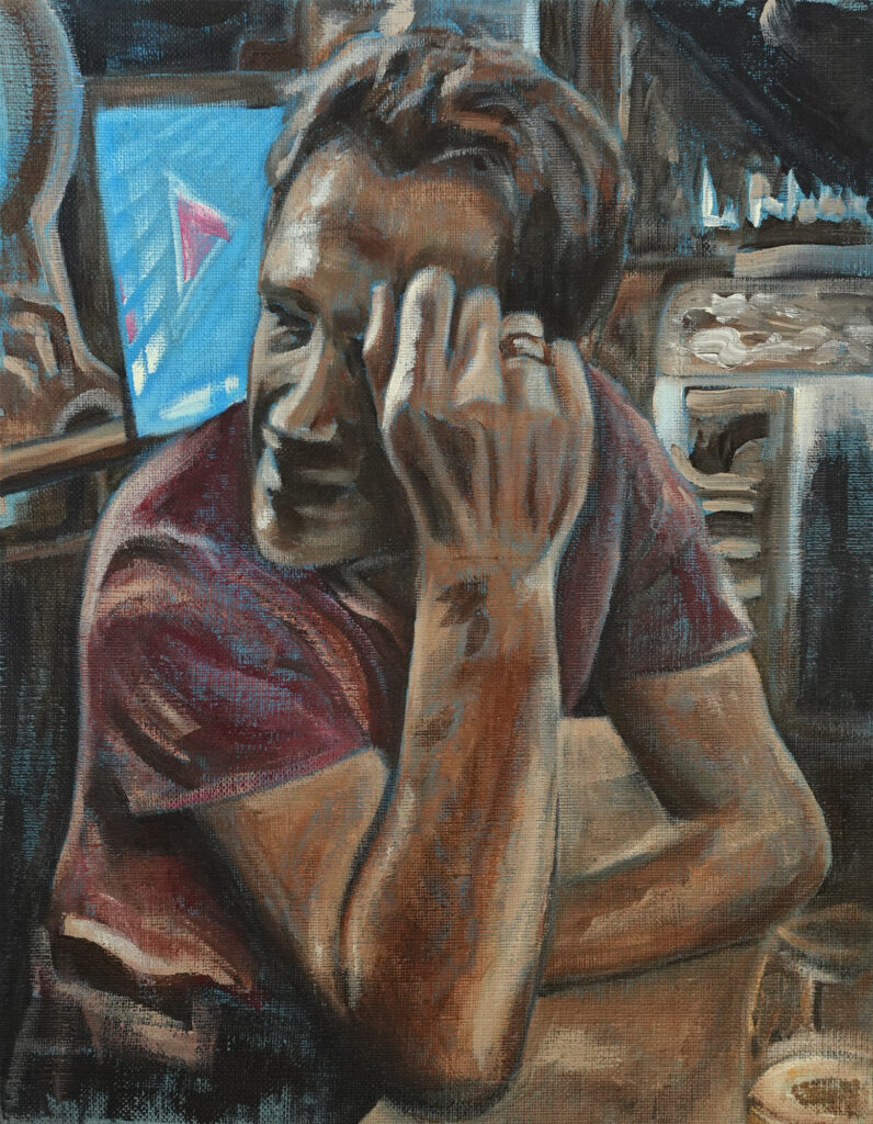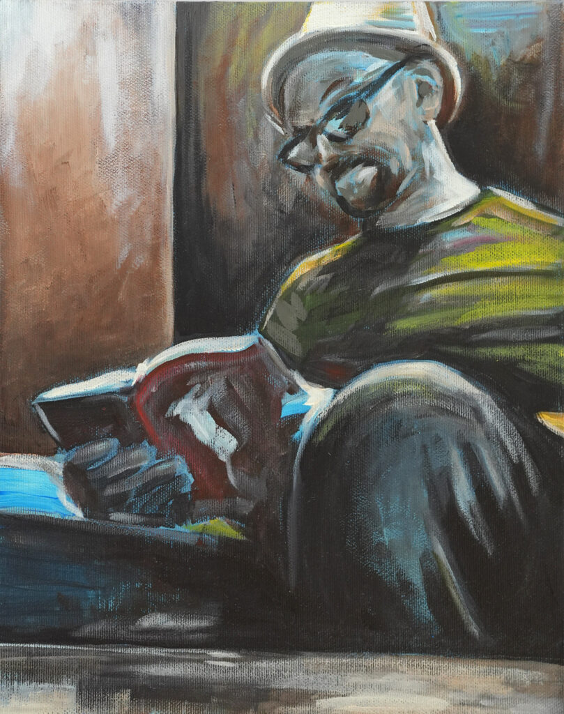 Möglich ist hier natürlich das klassische Portrait, also der vollkommene Fokus auf das Gesicht des Portraitierten. Hier kann ich die Mimik besonders detailliert herausarbeiten, daran habe ich große Freude. Beinahe noch lieber male ich allerdings die sogenannte Halbfigur, also ein Bildnis des gesamten Oberkörpers von der Hüfte an. Die Körperhaltung, die typische Pose sagt soviel über einen Menschen aus und komplettiert das Bild. Auch kann ich den Portraitierten hier in seiner „natürlichen Umgebung“, mit seinem liebsten Haustier, einem Musikinstrument, bei Tisch abbilden – die Möglichkeiten sind endlos. Gerade die kleinen, alltäglichen, beiläufigen Situationen interessieren mich hier besonders, denn dort kommt am ehesten der wirkliche, ungekünstelte Mensch zum Vorschein.